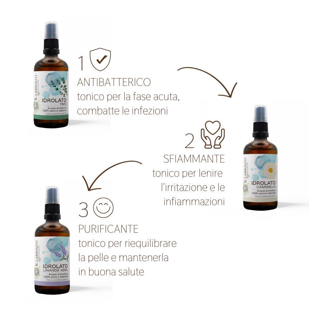 Combatti l'acne con prodotti 100% naturali! Questi 3 idrolati agiscono da soli ed in sinergia per contrastare i disagi della pelle acneica e infiammata.